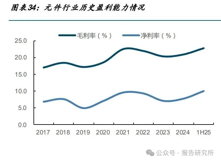 元件行业 25H1 毛利率为 22.8%,同比+1.9pct,净利率为 10.1%,同比+1.7pct。25Q2 毛 利率为 23.6%,同比+2.6pct,环比+1.8pct,净利率为 10.7%,同比+1.8pct,环比+1.3pct。