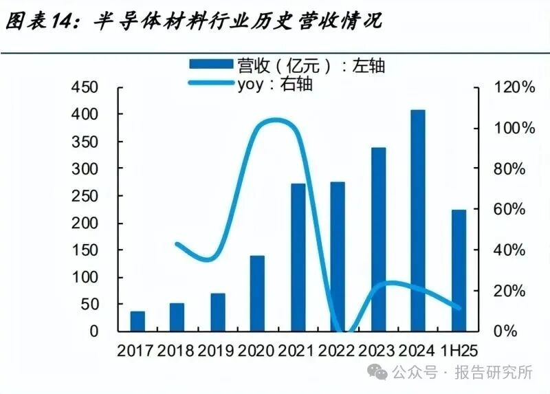 半导体材料行业25H1营收为222.6亿元,同增11.4%,归母净利润为14.2亿元,同增11.1%。 25Q2 营收为 119.3 亿元,同增 19.2,环增 15.5%,归母净利润为 7.6 亿元,同增 20.2%, 环增 14.5%,材料相对后周期,行业β会受到半导体行业景气度的影响。